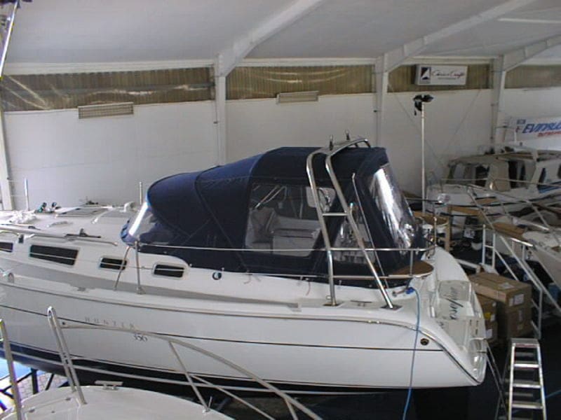 Klappverdeck mit Verlängerung Verlängerung mit einem Bügel. Auf Wunsch mit Fenstern seitlich. Kombinierbar mit “Vorhang”. Mit Reißverschluss-Verbindung zur Sprayhood.
